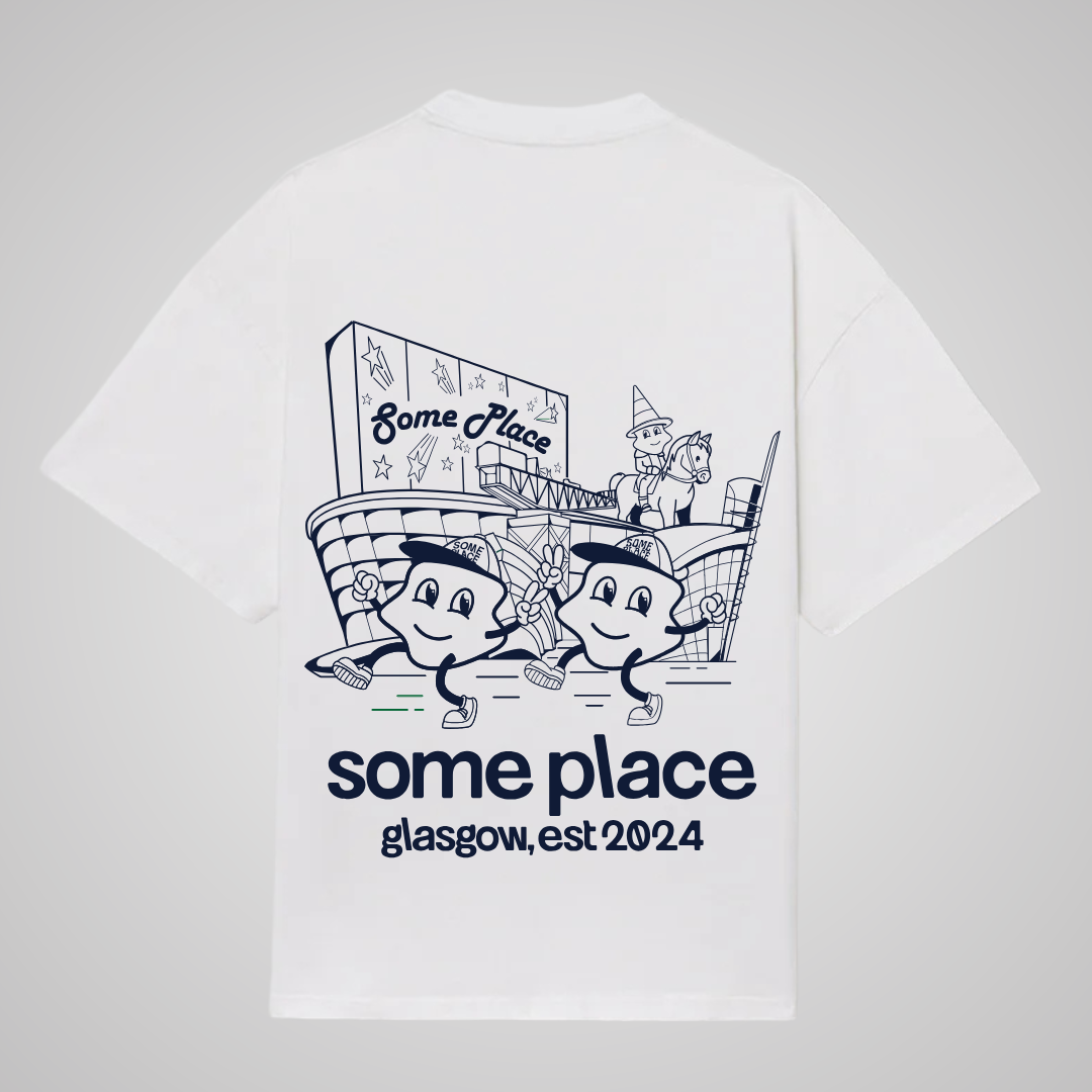 Oversized fit t-shirt in 300 GSM pre-shrunk cotton jersey with screen print finish. Round neck, ribbed collar, and double-needle stitching on shoulders for durability.